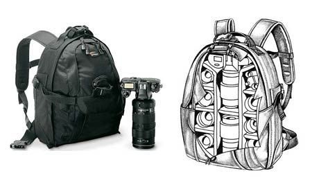 Mochila fotográfica lowepro Mini Trekker AW com capa de chuva.